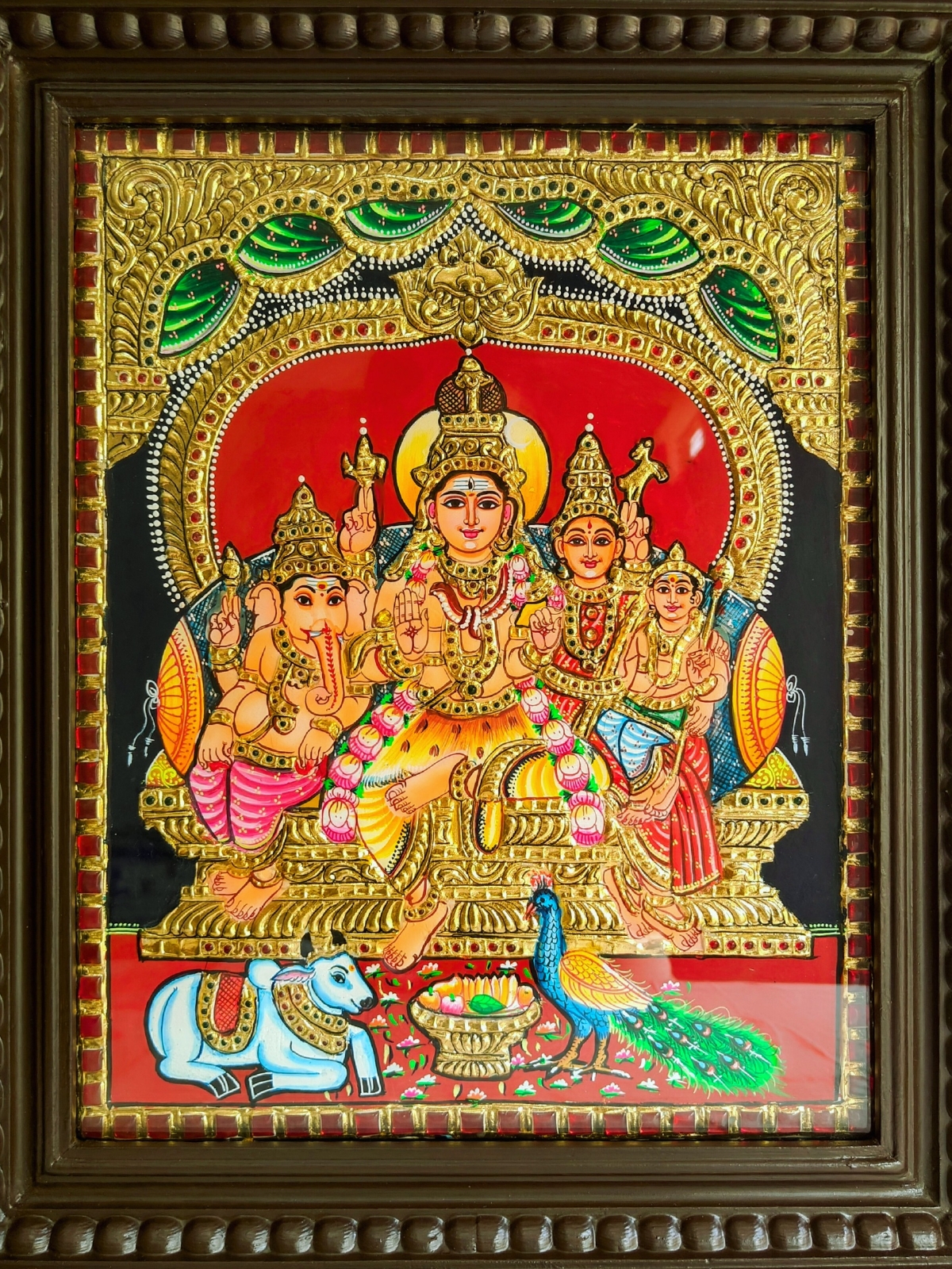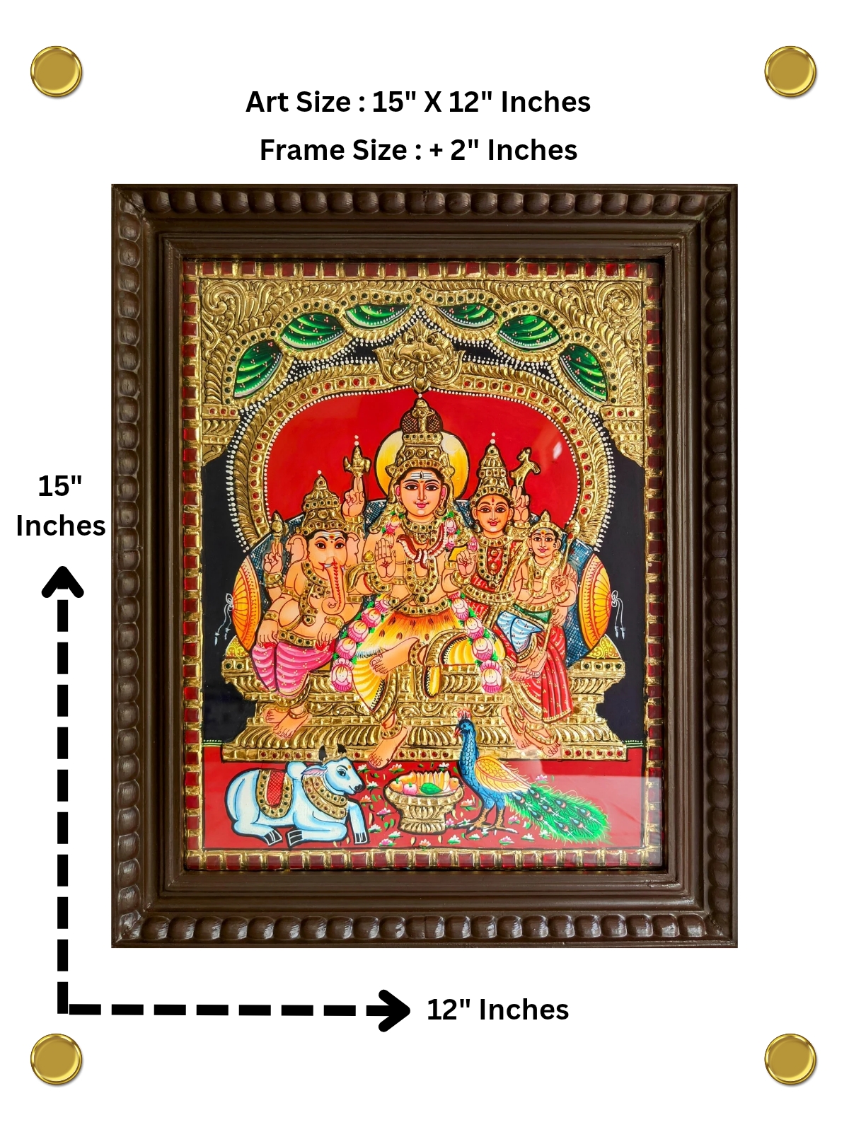 Immerse yourself in the divine beauty of this exquisite Tanjore painting featuring Lord Shiva Parivar (Lord Shiva Family) in a stunning 2D flat design. Meticulously handcrafted by skilled artisans from Thanjavur, this masterpiece measures 15 X 12 Inches with an additional 3 inches frame. The artwork showcases the classical South Indian painting style, adorned with intricate gold leaf work and sparkling Jaipur stones that create a mesmerising visual appeal. Set in a traditional teakwood mani frame with glass protection, this painting exemplifies the renowned Thanjavur art form that originated in Tamil Nadu. The vibrant colours, combined with the glittering embellishments, make this piece a perfect addition to your home or workplace, creating an atmosphere of spiritual elegance. Each detail reflects the rich cultural heritage of Thanjavur paintings, traditionally crafted on wooden planks with meticulous attention to detail. This timeless piece serves as an ideal gift for those who appreciate authentic Indian artistry.