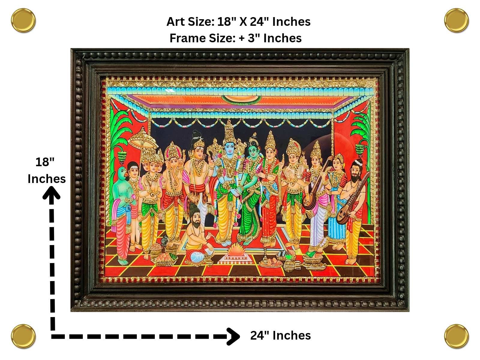 Immerse yourself in the divine beauty of this exquisite Tanjore painting featuring Srinivasa Kalyanam in a stunning 2D flat design. Meticulously handcrafted by skilled artisans from Thanjavur, this masterpiece measures 24 X 18 Inches with an additional 3 inches frame. The artwork showcases the classical South Indian painting style, adorned with intricate gold leaf work and sparkling Jaipur stones that create a mesmerising visual appeal. Set in a traditional teakwood mani frame with glass protection, this painting exemplifies the renowned Thanjavur art form that originated in Tamil Nadu. The vibrant colours, combined with the glittering embellishments, make this piece a perfect addition to your home or workplace, creating an atmosphere of spiritual elegance. Each detail reflects the rich cultural heritage of Thanjavur paintings, traditionally crafted on wooden planks with meticulous attention to detail. This timeless piece serves as an ideal gift for those who appreciate authentic Indian artistry.
